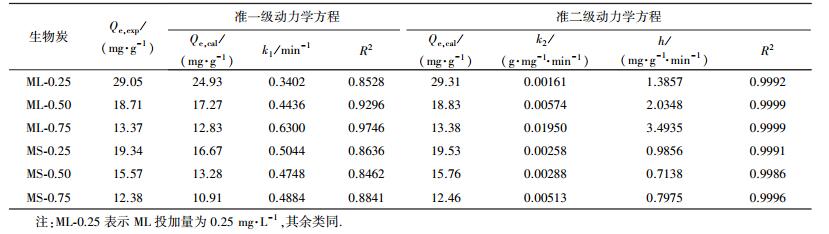 將200 mL 10 mg·L-1的亞甲基藍(lán)置于250 mL具塞錐形瓶中, 投加0.05 g生物炭, 然后將錐形瓶放進(jìn)恒溫振蕩培養(yǎng)箱, 在(25±1) ℃條件下以150 r·min-1的轉(zhuǎn)速振蕩, 分別于5、10、20、40、60、90、120、180、240、360、600、960、1440 min時取樣;用移液器取3 mL上清液置于離心管內(nèi), 在8000 r·min-1下離心分離5 min, 然后用移液器取液2 mL, 稀釋后于665 nm波長處用紫外可見分光光度計測試亞甲基藍(lán)的濃度.每個處理設(shè)3個平行, 取平均值進(jìn)行分析.