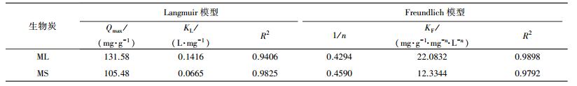 式中, Qe為吸附平衡時生物炭對亞甲基的吸附量(mg·g-1);Qm為生物炭對亞甲基的飽和吸附量(mg·g-1);KL為Langmuir吸附平衡常數(shù)(L·mg-1);KF為Freundlich吸附平衡常數(shù)(mg·g-1·mg-n·L-n);Ce為吸附平衡時溶液的亞甲基藍(lán)濃度(mg·L-1), 1/n為Freundlich指數(shù).
