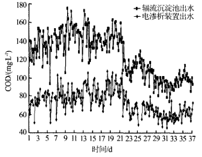 從圖3可知,在輻流沉淀池出水COD 平均為107.1 m g/L 條件下,電滲析裝置出水的COD 平均為77.84 m g L ,平均去除率為 27.3%.說明多介質(zhì)過濾器、自清洗過濾器對輻流沉淀池出水COD 去除效果穩(wěn)定,可以保證電滲析裝置正常運行根據(jù)工程實際運行工況。電滲析裝置的清洗周期一般為2 個月。