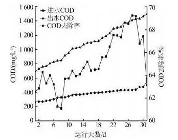 由圖4可見(jiàn),隨著進(jìn)水濃度的不斷增加,整個(gè)生化系統(tǒng)COD去除率基本上呈現(xiàn)線性增長(zhǎng)。在第28d進(jìn)水COD提升至1400mg/L時(shí),整個(gè)生化系統(tǒng)COD去除效果達(dá)到最佳為69.24%。從第28~31d隨著進(jìn)水COD的進(jìn)一步提升,整個(gè)生化系統(tǒng)去除效果逐漸下降。故對(duì)于此種廢水其進(jìn)水COD最佳為1400mg/L。
