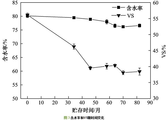 圖 3主要考察了污泥在貯存過程中含水率及VS隨貯存時(shí)間的變化情況.