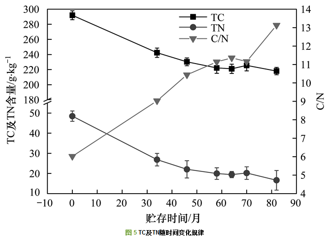 從圖 6可以發(fā)現(xiàn)NH4+-N含量先逐漸上升, 后持續(xù)減少, 最初為(6.94±1.11) g·kg-1, 在第34個月達(dá)到最大值(10.06±0.99) g·kg-1, 最后降至(2.21±0.57) g·kg-1. NO3--N含量在此過程中表現(xiàn)出與NH4+-N相反的趨勢, 含量呈現(xiàn)輕微的上升趨勢, 增加幅度有限.這主要是由于在初期, 有機(jī)氮不斷被微生物分解為銨態(tài)氮, 因此銨態(tài)氮含量出現(xiàn)短暫上升.之后銨態(tài)氮轉(zhuǎn)化為氨氣揮發(fā), 以及硝化細(xì)菌的硝化作用, 使得銨態(tài)氮含量下降, 硝態(tài)氮含量呈現(xiàn)上升.同時(shí)在貯存初期較低的C/N比, 意味著氮素過量, 使得氮素很容易轉(zhuǎn)化為氨氣揮發(fā)而導(dǎo)致氮素?fù)p失.同時(shí)隨著貯存時(shí)間延長局部缺氧會導(dǎo)致硝態(tài)氮的反硝化作用加強(qiáng), 進(jìn)一步導(dǎo)致氮素?fù)p失.
