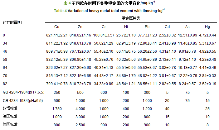 (4) Cu、Zn、Cr、Ni、Pb、Cd、As、Hg等重金屬含量及形態(tài)在貯存過程中并未發(fā)生明顯規(guī)律性變化, 大部分重金屬均以可氧化態(tài)及殘?jiān)鼞B(tài)比較穩(wěn)定的形態(tài)存在, 不易被植物吸收利用.