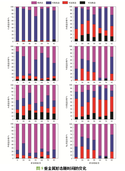 可以發(fā)現(xiàn)各種形態(tài)之間的轉(zhuǎn)化并不明顯, 且大部分的重金屬始終以比較穩(wěn)定的可氧化態(tài)和殘?jiān)鼞B(tài)形態(tài)存在, 并未發(fā)現(xiàn)可交換態(tài)等不穩(wěn)定態(tài)向較穩(wěn)定的可氧化態(tài)及殘?jiān)鼞B(tài)大幅度轉(zhuǎn)變, 說明貯存時(shí)間對重金屬形態(tài)變化影響并不顯著.