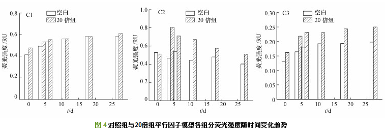 由平行因子分析法分析得到空白組與20倍組上覆水中溶解性有機(jī)質(zhì)(DOM)的主要組分有3個(gè), 分別為C1、C2、C3(圖 3).如表 2所示, 組分C1(235、295 nm/396 nm)、C3 (265、365 nm/446 nm)均有2個(gè)激發(fā)波長峰值, 1個(gè)發(fā)射波長峰值, 屬于類腐殖質(zhì)熒光組分.C1(235 nm/396 nm)對應(yīng)A峰, 屬于紫外類腐殖質(zhì), C1(295 nm/396 nm)對應(yīng)M峰, 屬于UVA類腐殖質(zhì);C3(265 nm/446 nm)處于A峰范圍內(nèi), C3(365 nm/446 nm)對應(yīng)C峰, 屬于可見類腐殖質(zhì), 類腐殖質(zhì)峰以紫外類腐殖質(zhì)峰(A峰)為主要存在形式, 可推斷為分子量較大的UVC類腐殖質(zhì)物質(zhì);C2(230、275 nm/336 nm)屬于類蛋白物質(zhì), 并且激發(fā)和發(fā)射波長范圍恰好處在類色氨酸熒光峰范圍內(nèi), 含有類色氨酸基團(tuán), 因此, 屬于類色氨酸類, 可認(rèn)為來源于藻類降解, 其中, 230 nm/336 nm對應(yīng)S峰, 275 nm/336 nm屬于T峰.各組分值以熒光峰最高處的熒光強(qiáng)度即Fmax(RU)表示, 熒光強(qiáng)度越大, 物質(zhì)組分的相對含量越高.