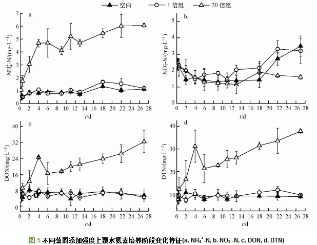 相關(guān)研究表明, 沉積物中氮礦化會釋放各種形態(tài)無機(jī)氮(NH4+-N、NO3--N、NO2--N)至上覆水中, 且礦化程度和礦化速率與沉積物中有機(jī)質(zhì)含量息息相關(guān).實(shí)驗(yàn)前4 d, 空白組與1倍組DIN與DON釋放無顯著性差異且釋放量相對穩(wěn)定(圖 5a~c), 原因在于對照組在實(shí)際環(huán)境已經(jīng)接受了與1倍組相近濃度的藍(lán)藻碎屑的輸入, 其對沉積環(huán)境的生物理化性狀已經(jīng)有所影響.而添加1倍藻屑組不足以引起更大的影響, 所以二者差別不大.因此, 在下一步實(shí)驗(yàn)中將增加藍(lán)藻濃度梯度研究, 獲得引起明顯改變的藻屑添加量閾值.其中, NO3--N是空白組與1倍組DIN的主要形式.高密度藻屑(20倍組)輸入至沉積物使得沉積物有機(jī)質(zhì)含量劇增, 藻屑礦化產(chǎn)生大量DTN(圖 5d).同時(shí), 20倍組藻屑來源的DTN由開始至實(shí)驗(yàn)結(jié)束增加了26.55 mg·L-1, DTN經(jīng)好氧微生物作用礦化為NH4+-N或小分子DON(圖 5a、5c、5d).20倍組藻屑分解促使DON濃度增加了23.34 mg·L-1, 同時(shí)藻屑耗氧降解釋放出大量DIN, 形態(tài)以NH4+-N為主, 與空白組與1倍組差異明顯.主要原因是受到DO的限制, 藻屑有機(jī)質(zhì)活性高, 需氧能力強(qiáng), 能夠快速利用沉積物溶氧, 造成厭氧環(huán)境.因DO減少或不足使NO3--N成為電子受體參與氮礦化進(jìn)程, 使得反硝化作用增強(qiáng), NO3--N轉(zhuǎn)化成N2或N2O, 導(dǎo)致NH4+-N不斷累積增加, NO3--N濃度降低.同時(shí),O2是影響氮礦化速率的重要限制性因子, 一般認(rèn)為好氧條件下氮礦化速率高于缺氧或厭氧條件.因此, 第4 d后的實(shí)驗(yàn)階段, 空白組與1倍組受到有機(jī)質(zhì)含量的影響, 氮素濃度基本不變.而20倍組處于缺氧或厭氧狀態(tài), 導(dǎo)致有機(jī)質(zhì)厭氧礦化分解速率減緩, 也可能受pH升高條件限制, 微生物活性降低, 造成氨氮(NH4+-N)釋放速率降低.但由于加藻量較多, 藻屑分解導(dǎo)致DTN、NH4+-N濃度不斷增加.且可能由于厭氧條件下微生物對氮的需求量較少, 導(dǎo)致厭氧條件下DIN釋放形態(tài)仍以NH4+-N為主(圖 7).