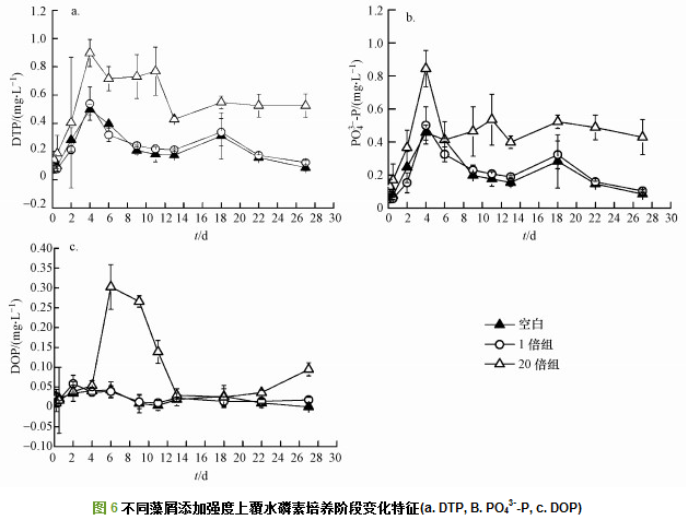 藻屑加入沉積物后PO43--P與DTP快速釋放, 上覆水中PO43--P與DTP變化趨勢相同.各實(shí)驗(yàn)組PO43--P與DTP均在前4 d顯著增加, 并在第4 d到達(dá)最高值(圖 6a、6b).第4 d到達(dá)峰值后上覆水中PO43--P與DTP濃度降低, 隨時(shí)間變化無顯著差異.各個(gè)實(shí)驗(yàn)組相比, 空白組與1倍組PO43--P與DTP釋放量無顯著差異(p > 0.05).20倍組PO43--P與DTP釋放程度遠(yuǎn)高于空白組與1倍組, 其中,空白組、1倍組和20倍組PO43--P最高濃度分別為0.46、0.50和0.90 mg·L-1.空白組與1倍組DOP釋放較為平穩(wěn), 實(shí)驗(yàn)期間無顯著性差異(p > 0.05)(圖 6c).20倍組DOP釋放前4 d與其他兩組無顯著性差異, 但在第4~6 d增加0.25 mg·L-1, 第6 d后逐漸降低至穩(wěn)定(圖 6c).說明低密度藻屑添加條件下直接通過藻屑分解釋放的DOP較低, 主要是由沉積物礦化引起的釋放.高密度藻屑輸入在短時(shí)期內(nèi)分解可促進(jìn)沉積物中PO43--P與DTP釋放, 并且釋放的DTP主要以PO43--P形態(tài)釋放, 占DTP釋放比例的57.74%~93.10%.