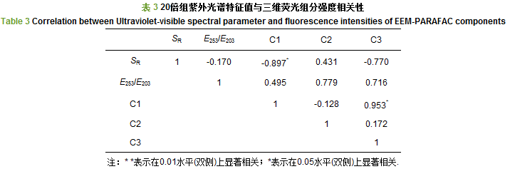 在本實(shí)驗(yàn)的20倍組中發(fā)現(xiàn)大量類色氨酸類物質(zhì)(C2)和類腐殖質(zhì)類物質(zhì)(C1、C3)(圖 4), 熒光強(qiáng)度均高于空白對照組, 說明藻屑分解初期釋放出大量類蛋白物質(zhì)和少量類腐殖質(zhì)類物質(zhì)(C1、C3).研究表明, 類色氨酸類物質(zhì)易被微生物利用降解, 同時(shí)微生物活動(dòng)也可使得類腐殖質(zhì)含量增加.類腐殖質(zhì)類物質(zhì)的來源一般側(cè)重于海洋深水生態(tài)系統(tǒng), 但由于人為及藻類降解等原因, 目前在淡水生態(tài)系統(tǒng)也有所發(fā)現(xiàn).實(shí)驗(yàn)初期DOM以類色氨酸為主, 對熒光強(qiáng)度的貢獻(xiàn)比例為51.73%, 類色氨酸在后期由于細(xì)菌降解利用, 熒光強(qiáng)度降低, 同時(shí)難分解的類腐殖質(zhì)組分C1、C3熒光強(qiáng)度逐漸增高(圖 4a、4c), 分子量大的類腐殖質(zhì)成為主要成分, 最終含量高于類色氨酸(圖 4).相關(guān)性分析表明, C3與C1熒光強(qiáng)度呈顯著正相關(guān)(p < 0.05), 與SR呈顯著負(fù)相關(guān)(p < 0.05)(表 3).可協(xié)同表明上覆水中DOM分子量變化及藻屑的腐殖化程度.傅平青等認(rèn)為羰基/羧基與類腐殖質(zhì)熒光有關(guān), E253/E203作為表征DOM取代基種類的重要指標(biāo), 而在表 4中并未發(fā)現(xiàn)E253/E203與C1、C3熒光強(qiáng)度具有顯著相關(guān)性(p > 0.05).任保衛(wèi)等(2007)和呂桂才等研究發(fā)現(xiàn), 假藻、赤潮藻在生長階段產(chǎn)生類色氨酸熒光物質(zhì)、類腐殖質(zhì)熒光物質(zhì), 類色氨酸熒光強(qiáng)度在穩(wěn)定期達(dá)到最高, 而后由于細(xì)菌降解使其熒光強(qiáng)度降低.相反, 類腐殖質(zhì)熒光強(qiáng)度在消亡期后逐漸增加.與本次實(shí)驗(yàn)20倍組中類色氨酸熒光強(qiáng)度先升高后降低的變化結(jié)果一致.
