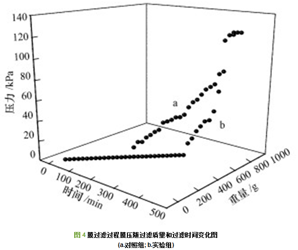 對于生物膜動態(tài)過濾培養(yǎng)過程, 膜過濾過程中膜壓隨過濾液質量及時間變化如圖 4所示.由圖可以看出, 當過濾重量為359.71 g, 過濾時間170 min時, 對照組膜孔(即過濾液中沒有雙(3-氨基丙基)胺)發(fā)生了一定程度的堵塞, 此時膜壓為10 kPa, 但實驗組(即過濾液中加有雙(3-氨基丙基)胺)中的膜壓仍然為0, 表明膜孔徑并沒有像對照組膜堵塞嚴重;當過濾液質量為628.55 g, 過濾時間為300 min時, 實驗組中的膜壓力開始上升, 膜壓為12.5 kPa, 約為過濾時間175 min時的對照組膜壓, 而此時對照組中的膜壓已經為50 kPa.這表明雙(3-氨基丙基)胺可減緩膜過濾過程中膜孔堵塞速度, 降低膜壓, 緩解由微生物引起的膜污染問題.