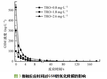 2) 接觸反應(yīng)時間研究影響表明, 在TRO閾值濃度下接觸反應(yīng)6 s, 對100 ~500 ng·L-1范圍水樣的GSM去除率均大于90%, 延長反應(yīng)時間至180 s, 水樣中GSM殘余量均低于10 ng·L-1.投加·OH淬滅劑TBA實驗表明, 對GSM起氧化降解作用的主要氧活性粒子為·OH.