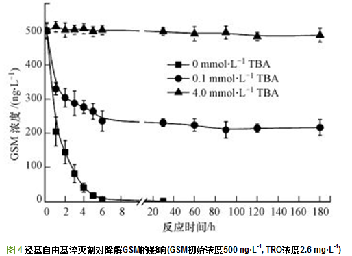 TBA是一種有效的·OH淬滅劑, 它與·OH反應(yīng)速率常數(shù)為4.0×108 L·mol-1·s-1, .本實驗通過在GSM水樣中加入0.1 mmol·L-1和4.0 mmol·L-1 TBA, 淬滅反應(yīng)過程產(chǎn)生的·OH, 驗證降解GSM的主要物質(zhì)為·OH.實驗結(jié)果如圖 4所示, 加入TBA淬滅·OH后, 對GSM的氧化降解效果明顯降低.當(dāng)TRO投加劑量為2.6 mg·L-1, 不加TBA時, 管路中接觸反應(yīng)6 s, 可將初始濃度500 ng·L-1 GSM降解到26 ng·L-1, 反應(yīng)180 s降解至2.0 ng·L-1, 對GSM氧化降解率為99%;當(dāng)水樣中加入的TBA濃度為0.1 mmol·L-1時, 管路反應(yīng)6 s, GSM降解到236 ng·L-1, 氧化降解率降低至52.8%, 延長反應(yīng)時間到180 s, GSM氧化降解率為56.5%;當(dāng)TBA濃度為4.0 mmol·L-1時, 反應(yīng)180 s對GSM氧化降解率降低至14.6%.