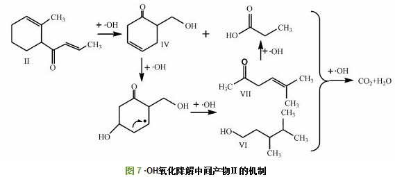 ·OH氧化降解二級中間產(chǎn)物的機(jī)制如圖 7所示, 以二級產(chǎn)物Ⅱ為例, 其側(cè)鏈比六元環(huán)更易與·OH發(fā)生加成反應(yīng), 被·OH斷鍵生成Ⅳ (1-oxo-5-hydroxy-methyl-2-cyclohexene)和小分子丙酸, 之后·OH攻擊Ⅳ環(huán)上C=C雙鍵, 斷裂己烯環(huán)生成三級小分子醛酮酸類產(chǎn)物Ⅵ (3, 4-dimethylpentan-1-ol)、Ⅶ (5-methyl-4(E)-hexen-2-one)以及丙酸, 這些醛、酮、酸類小分子有機(jī)物繼續(xù)被·OH氧化降解, 最終礦化生成H2O和CO2.