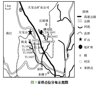 粵北大寶山礦是華南地區(qū)最大型的多金屬硫化物礦床.大寶山礦地處廣東省韶關(guān)市曲江和翁源兩縣的交界處, 流域范圍為東經(jīng)113°40′~113°43′、北緯24°30′~24°36′, 屬于亞熱帶季風(fēng)氣候區(qū), 溫暖潮濕多雨, 表層巖石風(fēng)化強(qiáng)烈.大寶山礦是一座大型鐵多金屬伴生礦床, 礦區(qū)主礦體上部為褐鐵礦體, 中部為銅硫礦體, 下部為鉛鋅礦體, 并伴生有鎢、鉍、鉬、金和銀等有色金屬礦和多種微量毒害元素(As、Hg、Cd、Ga、In、Tl、Se、Te、Mn、Sb、Sn等).礦山開(kāi)發(fā)后, 含有銅、鉛、錳、鉻等數(shù)種重金屬超標(biāo)的污水曾經(jīng)被排放到橫石河水中.含有超量金屬元素的污水長(zhǎng)期灌溉農(nóng)田, 造成土質(zhì)被破壞, 農(nóng)作物產(chǎn)量逐年下降, 而且威脅附近村民的健康.因此本文選取對(duì)人體健康危害較大的Pb、Cu、Mn、Cr 4種重金屬進(jìn)行研究.