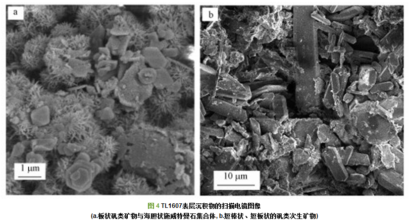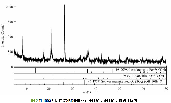 大寶山槽對(duì)坑、鐵龍尾AMD的表層沉積物中的礦物主要有4種類型:①各個(gè)采樣點(diǎn)均含有的風(fēng)化殘留礦物(石英、長(zhǎng)石、云母)和風(fēng)化產(chǎn)物高嶺石等;②鐵的氫氧化物次生礦物:鈉伯爾礦、纖鐵礦、四方纖鐵礦、施威特曼石、二線水鐵礦、針鐵礦;③鐵礬類次生礦物:黃鉀鐵礬, 水鐵礬、葉綠礬、粒鐵礬、高鐵礬、砷鐵礬、纖鈉鐵礬等;④AMD中罕見(jiàn)的次生礦物:水鈉錳礦、羥氧硫鉛礦(Sidpietersite)、偏砷酸氫鐵礦(Kaatialite).