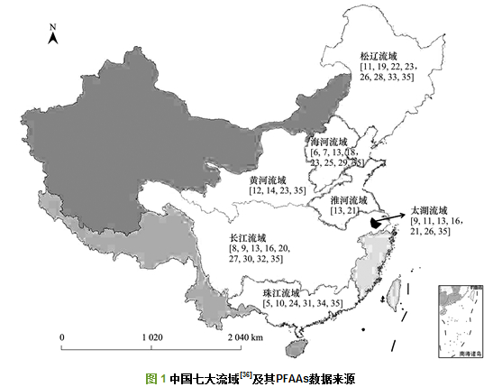 全氟烷基酸作為加工助劑和表面活性劑被廣泛應(yīng)用的同時, 所引起的生態(tài)污染及對人體健康的潛在威脅也受到了高度關(guān)注.有研究表明, 水體是PFAAs進(jìn)入環(huán)境的直接受體.中國河網(wǎng)密布、湖泊眾多, 根據(jù)主要河流覆蓋區(qū)域可劃分為松遼、海河、黃河、淮河、太湖、長江和珠江七大流域.各流域PFAAs污染程度與區(qū)域經(jīng)濟(jì)發(fā)展、自然地理特征等因素密切相關(guān).動物實(shí)驗(yàn)已經(jīng)證實(shí)全氟辛烷磺酸和全氟辛酸具有神經(jīng)毒性、生殖毒性和免疫毒性, 飲水暴露PFAAs的健康風(fēng)險(xiǎn)評價(jià)勢在必行.因此, 明確中國水資源污染現(xiàn)狀, 是評估國民飲水暴露PFAAs健康風(fēng)險(xiǎn)的重要基礎(chǔ).