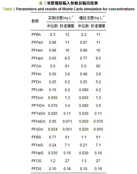 運(yùn)用蒙特卡羅算法, 模擬次數(shù)為10 000次, 分別獲得七大流域18種PFAAs的模擬濃度和中等暴露水平下成人的ADD模擬值.濃度模擬的輸入?yún)?shù)包括七大流域18種PFAAs濃度中位數(shù)及其標(biāo)準(zhǔn)偏差(表 2); ADD模擬的輸入?yún)?shù)包括七大流域18種PFAAs模擬濃度中位數(shù)及其標(biāo)準(zhǔn)偏差(表 2)、日均飲水?dāng)z入量(中位數(shù):1.9 L·d-1, 標(biāo)準(zhǔn)偏差:0.17)及體重(中位數(shù):61 kg, 標(biāo)準(zhǔn)偏差:3.4).風(fēng)險(xiǎn)評估結(jié)果的可靠性通過比對模擬值與計(jì)算值, 進(jìn)行不確定度分析.