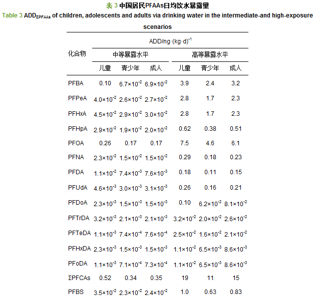 表 3列出了中、高等暴露水平下中國居民飲水的ADDΣPFAAs值.中等暴露水平下, 成人、青少年、兒童飲水的ADDΣPFAAs分別為0.42、0.41和0.63 ng·(kg·d)-1, PFOA、PFBA、PFOS之和占ADDΣPFAAs的66%.高等暴露水平下, 成人、青少年、兒童的ADDΣPFAAs分別為18、13、22 ng·(kg·d)-1, 是中等暴露水平的32~42倍, 碳鏈≤6的PFCAs攝入比例有所增加.各年齡段均未見性別間顯著性差異.隨著年齡增長, 體重(BW)增加遠(yuǎn)大于飲水量(IR)增加, 故IR/BW及ADDΣPFAAs值均應(yīng)呈下降趨勢.但在中、高等暴露水平下, 青少年飲水ADDΣPFAAs值低于成人, 表明我國青少年飲水量普遍低于建議量, 與文獻(xiàn)的報(bào)道相符.
