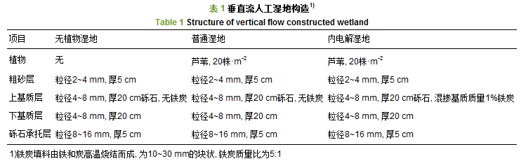 試驗(yàn)共構(gòu)建了3組呈圓柱體的下向垂直流人工濕地裝置, 分別為無植物濕地、普通濕地、內(nèi)電解濕地.裝置材料采用有機(jī)玻璃, 圓柱體尺寸為Φ×H=20 cm×65 cm.裝置底部設(shè)有高5 cm的集水區(qū), 并設(shè)置穿孔有機(jī)玻璃板進(jìn)行集水.采用遮光布包裹裝置四周, 以模擬人工濕地真實(shí)的避光狀態(tài).人工濕地裝置如圖 1所示.人工濕地以粗砂和礫石作為主要基質(zhì), 濕地植物選用蘆葦, 濕地構(gòu)建初期孔隙率為35%, 人工濕地構(gòu)造如表 1所示.裝置運(yùn)行時(shí), 尾水由蠕動(dòng)泵分別打入3組濕地上部, 底部出水, 通過流量計(jì)控制出水, 設(shè)計(jì)水力停留時(shí)間為2 d.
