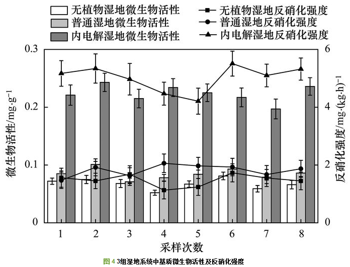 (2) 冬季低溫條件下, 內(nèi)電解濕地微生物活性和反硝化強(qiáng)度高于無植物濕地和種植植物的普通濕地.其中, 微生物活性達(dá)到0.224mg·g-1, 分別是無植濕地和普通濕地的2.6倍、3.4倍; 反硝化強(qiáng)度達(dá)到5.01 mg·(kg·h)-1, 分別是無植物濕地和普通濕地的2.8倍、3.3倍.具體聯(lián)系污水寶或參見http://wlmqsb.com更多相關(guān)技術(shù)文檔。