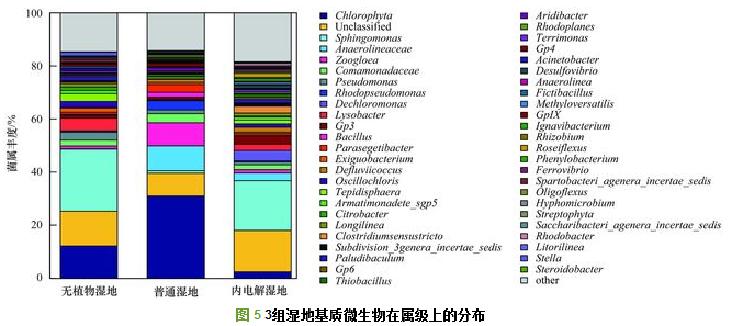近代生物學(xué)將微生物分為域(domain)、門(phylum)、綱(calss)、目(order)、科(family)、屬(genus)六層, 其中屬是分類中最基本的一層.人工濕地微生物在屬級(jí)水平的分類較多, 多達(dá)300余種, 因此按照菌屬豐度大小僅選取前50種進(jìn)行分析. 3組濕地前50種菌屬的豐度總和分別占總菌屬的85.33%、85.8%、81.55%. 3組濕地基質(zhì)微生物在屬級(jí)上的分布如圖 5所示.