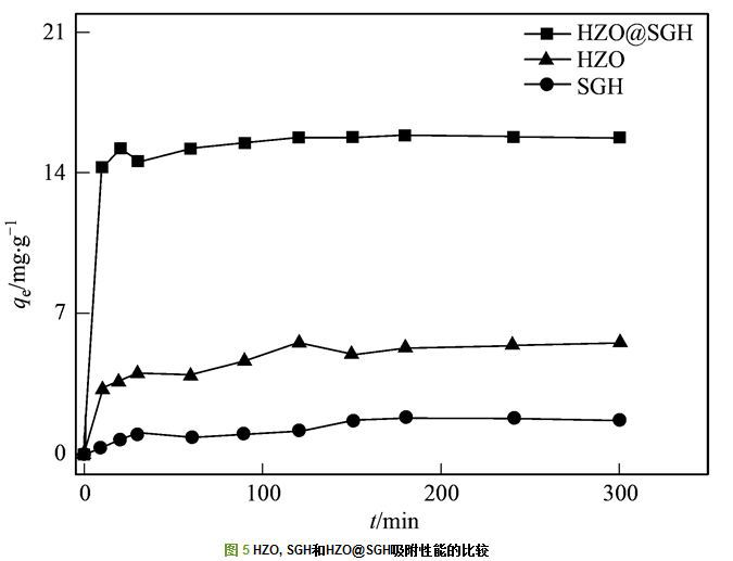 (1) 采用均相沉淀法制備HZO@SGH吸附劑, 通過XRD和SEM表征手段可知HZO屬于無定形結(jié)構(gòu), 能夠均勻地涂蓋到SGH表面使得HZO@SGH保持SGH獨(dú)特的三維網(wǎng)狀結(jié)構(gòu).