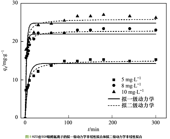 吸附動力學(xué)研究是一種探究吸附過程的重要方法.在25℃, pH=6.5, 不同氟離子初始濃度(5、8和10 mg ·L-1)條件下, HZO@SGH去除氟離子的吸附動力學(xué)曲線如圖 7所示, HZO@SGH對氟離子的吸附量隨著溶液中氟離子初始濃度增加而增大, 在吸附前30 min, 吸附速率較快, 隨后吸附速率逐漸減小, 在300 min基本達(dá)到吸附平衡.