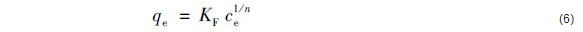 Freundlich吸附等溫方程是一種基于假設(shè)吸附劑表面是非均一的經(jīng)驗方程, 其非線性形式可由式(6)表示: