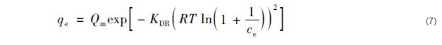 Dubinin-Radushkevich等溫模型常用于描述多孔材料的吸附過程和機(jī)制, 可由式(7)表示: