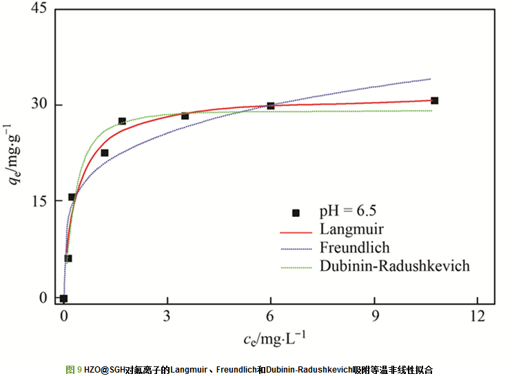 在常規(guī)條件下(25℃, pH=6.5), 測定HZO@SGH對不同初始濃度氟離子的吸附量, 并用Langmuir、Freundlich和Dubinin-Radushkevich吸附等溫模型進(jìn)行非線性擬合, 擬合結(jié)果如圖 9所示, 擬合參數(shù)見表 2.從中可看出, Langmuir等溫模型R2=0.955, Freundlich等溫模型R2=0.891, Dubinin-Radushkevich等溫模型R2=0.974, 比較各模型相關(guān)系數(shù)R2大小可知HZO@SGH對氟離子的吸附過程更符合Dubinin-Radushkevich等溫模型.在氟離子溶液初始pH=6.5條件下, 根據(jù)式(5)估算的RL=0.018, 說明氟離子在HZO@SGH的吸附類型是優(yōu)惠吸附; 根據(jù)式(8)估算的E=9.87 kJ ·mol-1, 說明溶液中氟離子主要通過靜電吸引和配位交換等化學(xué)吸附作用吸附到HZO@SGH表面.根據(jù)圖 9還可知, HZO@SGH達(dá)到吸附平衡后, 溶液中氟離子濃度從初始的≤8 mg ·L-1減小到≤1.19 mg ·L-1, 低于WHO規(guī)定的飲用水中氟離子的標(biāo)準(zhǔn)濃度(1.5 mg ·L-1), 表明HZO@SGH具有吸附去除飲用水中氟離子的應(yīng)用潛力.
