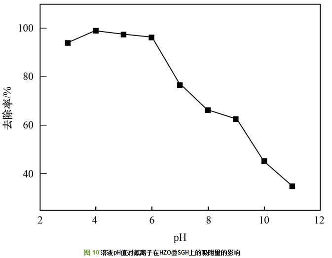 氟離子溶液的pH值大小是影響吸附劑吸附性能的重要因素之一.根據(jù)圖 10分析可知, 在pH為3~6.5的范圍內(nèi), HZO@SGH對氟離子的去除率達(dá)到89%以上, 當(dāng)溶液pH為4時, 氟離子的去除率達(dá)到最大值98%.隨著溶液pH值從6減小到4, HZO@SGH對溶液中氟離子的去除率略微增大, 這是因為在pH值較低的環(huán)境下, 大量的H+使得吸附劑表面質(zhì)子化而產(chǎn)生更多帶正電的吸附位點, 增強(qiáng)了其與電負(fù)性氟離子的靜電作用, 使更多的氟離子被吸附到吸附劑表面, 如化學(xué)方程式(9)和(11)所示.而當(dāng)溶液pH值從4減小到3或是從6增大到11, HZO@SGH的吸附性能都呈現(xiàn)下降趨勢, 前者可能是由于在更低的pH值條件下, 溶液中形成了HF而使能夠吸附到HZO@SGH上的游離的氟離子減少, 后者則是因為隨著溶液pH值的上升, HZO@SGH表面的質(zhì)子化作用逐漸減弱且溶液中大量OH-的存在會與氟離子競爭吸附劑表面的吸附位點, 從而導(dǎo)致氟離子在吸附劑上的吸附量減少, 并且在較高的pH條件下, 氟離子吸附到HZO@SGH主要是通過配位交換實現(xiàn)的, 如化學(xué)方程式(10)和(12)所示.
