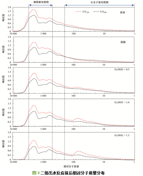 經(jīng)過(guò)臭氧化后, 一方面難凝聚有機(jī)物紫外吸收峰強(qiáng)度減弱更加明顯, 另一方面相對(duì)分子量位于100處出現(xiàn)一個(gè)明顯的紫外吸收峰, 且隨著臭氧投加量的增加, 該處吸收峰強(qiáng)度逐漸增加, 說(shuō)明臭氧能夠?qū)⒋蠓肿佑袡C(jī)物氧化分解為小分子有機(jī)物, 但難以將其完全氧化為CO2和H2O, 只是生成了一些中間物質(zhì), 這也是臭氧化后DOC降低不明顯的原因.