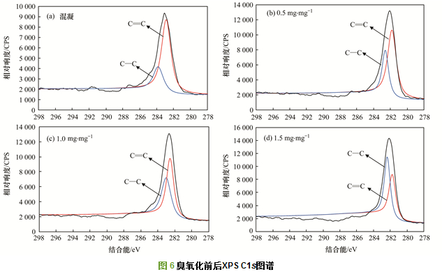 利用X射線光電子能譜(英國(guó)熱電, K-α)探究二級(jí)出水經(jīng)混凝和臭氧化處理后的碳元素價(jià)鍵形式. XPS分析前, 需將樣品放置在冷凍干燥機(jī)(北京博益康, FD-1C-50)中干燥成粉末后進(jìn)行測(cè)定.實(shí)驗(yàn)得到的元素電子結(jié)合能以C1s(285 eV)進(jìn)行校正. C1s譜圖應(yīng)用XPSPEAK41專(zhuān)業(yè)軟件進(jìn)行高斯分峰擬合, 對(duì)不同形態(tài)的碳原子進(jìn)行定量分析.