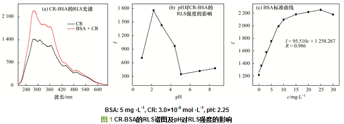 在靜電作用下, 生物大分子表面吸附陰離子染料, 導(dǎo)致生色團(tuán)聚集, 致使CR的RLS強(qiáng)度大幅增強(qiáng).圖 1(a)為CR和CR-BSA溶液(pH=2.25)于200~650 nm下的RLS譜圖.從中可知, 加入大分子BSA后CR的共振光強(qiáng)度大幅增強(qiáng), 是由于荷負(fù)電CR與荷正電BSA間形成了CR-BSA絡(luò)合物所致.且CR-BSA的譜圖特征與CR完全相似, 最大吸收峰值均為364 nm.