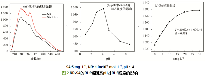 圖 2(a)為pH=4時(shí)NR-SA的RLS光譜, 從中可以看出, 在NR溶液中加入大分子SA樣品后, 共振光散射強(qiáng)度大大增強(qiáng), 這與CR-BSA的共振光散射光譜規(guī)律一致.選擇NR-SA絡(luò)合物的I值最大時(shí)的吸收波長292.6 nm為SA的檢測實(shí)驗(yàn)波長, 考察pH值對NR-SA體系的I值的影響.如圖 2(b)所示:在pH=4時(shí), 帶正電NR與荷負(fù)電的SA間產(chǎn)生較強(qiáng)的吸附作用, NR-SA絡(luò)合物的I值最大.隨著pH的增大, NR荷負(fù)電性逐漸增強(qiáng)而與SA間的吸附能力降低, 導(dǎo)致NR-SA的I值降低.