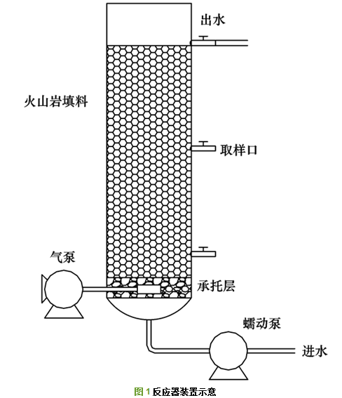 試驗(yàn)采用上向流生物濾柱反應(yīng)器(圖 1).裝置由有機(jī)玻璃制成, 內(nèi)徑20 cm, 承托層裝填5 cm, 濾料裝填45 cm, 反應(yīng)器有效容積為18 L.承托層采用粒徑為4~8 mm的礫石填料, 濾料為直徑5~10 mm的黑色火山巖.最下端取樣口距濾柱底部10 cm, 由下向上每隔25 cm設(shè)置一個(gè)取樣口.反應(yīng)器底部設(shè)曝氣裝置以進(jìn)行反沖洗, 外部纏繞黑色保溫棉以避光和保溫.