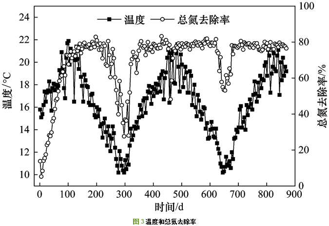 第153~244 d時(shí), 反應(yīng)器在秋季運(yùn)行, 進(jìn)水溫度為12.6~18.9℃.溫度在14℃以上時(shí), 反應(yīng)器氨氮、亞硝氮去除率大于95%, 溫度小于14℃時(shí), 氨氮和亞氮去除率明顯降低.第245 d, 反應(yīng)器運(yùn)行進(jìn)入冬季, 進(jìn)水溫度為10.2~14.3℃.由圖 3可知, 反應(yīng)器總氮去除率與進(jìn)水溫度密切相關(guān).進(jìn)水溫度在10~12℃時(shí), 總氮去除率為25%~60%.進(jìn)水溫度為12~14℃時(shí), 總氮去除率為55%~75%.第245~334 d, 反應(yīng)器最大出水總氮濃度為30.1 mg ·L-1, 平均總氮去除率為54.3%.