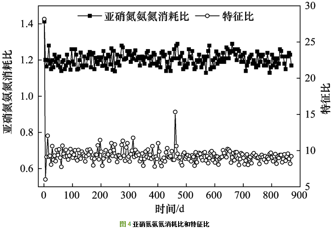 連續(xù)運(yùn)行階段反應(yīng)器氨氮, 亞硝氮和硝氮變化如圖 2所示, 進(jìn)水溫度及總氮去除率如圖 3所示.為了研究脫氮途徑, 引入?yún)捬醢毖趸磻?yīng)方程式, 如式(1)所示.厭氧氨氧化菌按1 :1.32的比例消耗氨氮和亞硝氮.厭氧氨氧化工藝生成的氮?dú)饬颗c硝氮量之比為8, 該值稱為特征比.試驗(yàn)亞硝氮氨氮消耗比和特征比如圖 4所示.