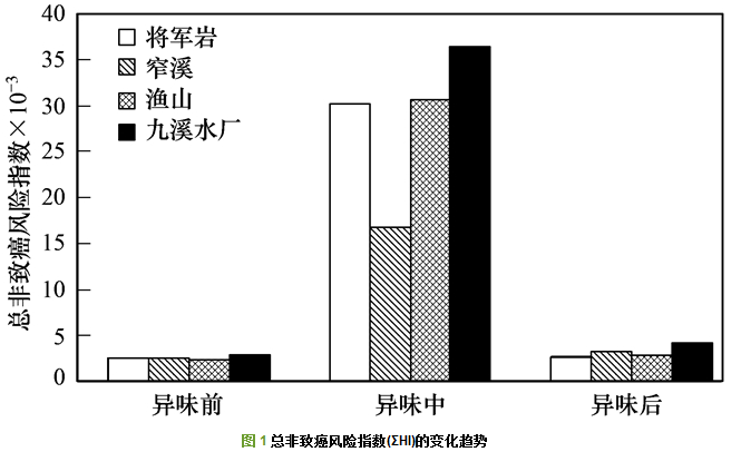 根據(jù)美國EPA的相關(guān)定義, 對于非致癌風(fēng)險, 當(dāng)風(fēng)險指數(shù)超過1時, 認(rèn)為會對人體健康產(chǎn)生危害.由圖 1可以看出, 4個斷面水樣中VOCs和SVOCs總非致癌風(fēng)險指數(shù)ΣHI范圍大致為2.4×10-3~3.6×10-2, 遠(yuǎn)遠(yuǎn)小于1, 屬于社會人群可接受區(qū)間, 說明這些污染物不會對人體產(chǎn)生明顯的非致癌健康危害.從時間范圍來看, 異味事件發(fā)生期間, ΣHI范圍為1.7×10-2~3.6×10-2, 顯著高于發(fā)生前3個月或后3個月, 高出幅度大致為4~12倍, 風(fēng)險大幅放大.從空間分布來看, 異味事件發(fā)生期間, 各監(jiān)測斷面水體ΣHI最大值為3.6×10-2, 為下游的九溪水廠監(jiān)測斷面, 最低為中游的窄溪監(jiān)測斷面, 風(fēng)險指數(shù)僅為1.6×10-2, 從中游到下游ΣHI增加了1.2倍, 表明錢塘江杭州段中下游水體ΣHI總體成富集趨勢.