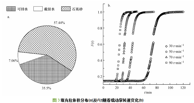 實(shí)驗(yàn)前, 對僅填充石英砂的填充柱進(jìn)行水力特性測定, 采用體積法測定填充柱內(nèi)石英砂、保留水和可排出水的體積.水力停留時(shí)間HRT計(jì)算公式如下: