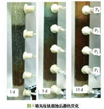 填充柱內(nèi)鐵腐蝕過程顏色變化如圖 5所示.實(shí)驗(yàn)1 d后, 填充柱底層ZVI腐蝕氧化呈黃褐色, 頂部ZVI顏色無變化, 表明進(jìn)水中存在微量DO, 使底部ZVI發(fā)生有氧腐蝕而被消耗.實(shí)驗(yàn)5 d后, 黃褐色向上移動(dòng)且頂部產(chǎn)生Fe2+呈現(xiàn)墨綠色.15 d后, 填充柱內(nèi)ZVI全被氧化腐蝕, 在石英砂表面呈現(xiàn)黃褐色.ZVI腐蝕變化與鐵離子溶出曲線相一致.進(jìn)水中的飽和DO可促進(jìn)ZVI腐蝕, 形成纖鐵礦(γ-FeOOH)、磁鐵礦(Fe3O4)、磁赤鐵礦(γ-Fe2O3).由累積總鐵曲線(圖 4)可知, R1和R2填充柱總鐵流出量在5 d后出現(xiàn)明顯差別, 15 d后曲線趨于穩(wěn)定;實(shí)驗(yàn)期間, 鐵的總流出量在R1和R2填充柱中分別達(dá)到472 mg和656 mg;相對于鐵的填充量(8.168 g)來說, 出口鐵流失總量低于10%;但實(shí)驗(yàn)初期出水總鐵含量相對較高容易造成出水中鐵離子污染, 進(jìn)一步考慮到我國飲用水標(biāo)準(zhǔn)要求砷和鐵的濃度限值分別為0.05 mg·L-1和0.3 mg·L-1, 利用該技術(shù)處理飲用水水源砷污染過程中需要在出水后采用吸附等技術(shù)截留可能超標(biāo)的砷和鐵污染物.