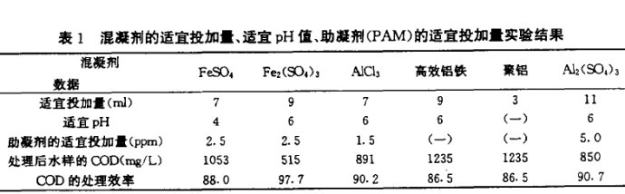 利用聚合抓化鋁和聚合硫酸鐵進(jìn)行上述同樣實(shí)驗(yàn),效果均不理想。由表1可以看出Fe:(50弓),投加量在glrn,pH在6左右,助凝劑PAM投加量是2.SPpm時(shí),對(duì)廢水COD處理效率最高。