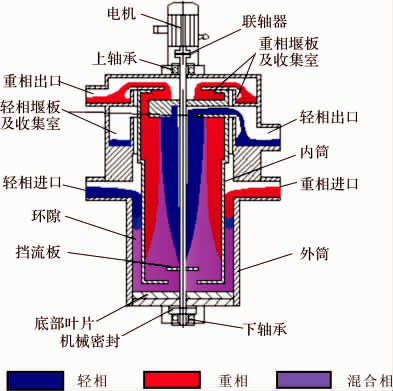旋流萃取技術(shù)主要用于具有密度差的兩液相的混合萃取和分離,主要包括混合傳質(zhì)過(guò)程與兩相分離過(guò)程,都在旋流萃取機(jī)中完成,如圖所示。互不相溶的兩液相分別自2個(gè)切向進(jìn)料管口進(jìn)入外筒與轉(zhuǎn)子之間的環(huán)隙,然后受到表面摩擦作用而劇烈混合,在環(huán)隙里產(chǎn)生了泰勒渦流,兩相之間便發(fā)生萃取傳質(zhì)過(guò)程。混合后的液體通過(guò)轉(zhuǎn)子底部的通道進(jìn)入轉(zhuǎn)子內(nèi)部。具有自吸泵功能的轉(zhuǎn)子內(nèi)部分為4個(gè)豎直的腔體,在轉(zhuǎn)子里的混合液受到強(qiáng)大的離心力作用而被分成兩層。密度大的液體受到的離心力較大被甩向轉(zhuǎn)子的內(nèi)壁,密度小的液體被迫擠向轉(zhuǎn)子中間部分,待液體相互平衡時(shí),輕、重相液體明顯分層,在轉(zhuǎn)子內(nèi)從下而上流動(dòng)過(guò)程中逐漸分離。分離區(qū)從擋流盤直到輕相堰,保證有足夠的時(shí)間形成液—液分離界面。分離開(kāi)的液—液相分別通過(guò)輕、重相堰匯集到各自的收集腔,由各自出口排出。重相堰板可以拆下更換以改變堰板直徑。