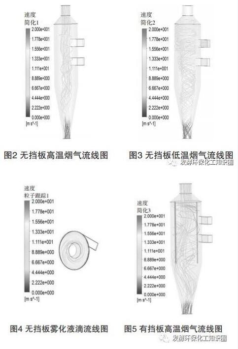(2)整流板對(duì)蒸發(fā)設(shè)備內(nèi)部流場的影響為避免高溫?zé)煔庵苯訌恼舭l(fā)器中心區(qū)域流出蒸發(fā)器,在蒸發(fā)器上部椎體處設(shè)置一篩板,篩板中心開孔率為10%左右,四周開孔率為30%左右,流程模擬圖如圖8。由模擬圖8可知,高溫?zé)煔鈴捻敳窟M(jìn)入,通過放大氣流截面和煙氣整流裝置,使煙氣流速均勻,速度適當(dāng),液體噴灑在此位置,更有利于噴灑的水霧分散。