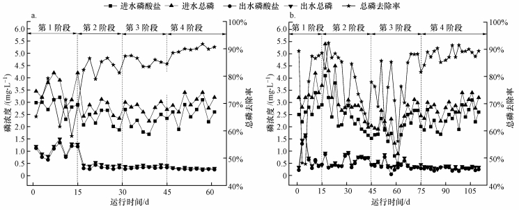 生物吸附/A2O和生物吸附/MBR/硫鐵自養(yǎng)反硝化兩套污水處理工藝進(jìn)出水總磷及磷酸鹽濃度變化如圖 4所示.進(jìn)水總磷的濃度為0.89~5.40 mg·L-1, 平均值為2.9 mg·L-1, 標(biāo)準(zhǔn)偏差為0.67%.經(jīng)測(cè)定總磷的組成中大部分為磷酸鹽, 平均占比為81.5%.生物吸附段的吸附作用可以去除部分磷(Lee et al., 2008), 但在生物吸附/A2O工藝中, 主要通過(guò)活性污泥的生物除磷; 在生物吸附/MBR/硫鐵自養(yǎng)反硝化組合工藝中, 主要通過(guò)硫鐵自養(yǎng)反硝化中的鐵屑析出Fe3+, 進(jìn)而與磷酸鹽結(jié)合去除.如圖 4a所示, 在生物吸附/A2O工藝運(yùn)行的第1階段, 由于缺少碳源, 生物除磷效果不佳, 出水總磷的平均值為1.12 mg·L-1, 總磷的去除率僅為68.5%, 標(biāo)準(zhǔn)偏差分別為1.56%和6.7%.第2階段開始投加污泥發(fā)酵液, 隨著外部碳源的投加, 除磷效果明顯改善, 出水總磷的平均值為0.37 mg·L-1, 平均去除率達(dá)到86.4%, 標(biāo)準(zhǔn)偏差分別為0.067%和3.3%, 這說(shuō)明投加污泥發(fā)酵液后A2O系統(tǒng)的生物除磷效果提高, 標(biāo)準(zhǔn)偏差也隨之降低.在生物吸附/MBR/硫鐵自養(yǎng)反硝化組合工藝運(yùn)行的第1階段, 如圖 4b所示, 由于鐵屑尚未大面積析出Fe3+, 無(wú)法與磷酸鹽結(jié)合, 導(dǎo)致除磷效果不佳, 總磷的去除率約為76%.盡管硫鐵自養(yǎng)反硝化濾池的HRT在第2、3階段分別延長(zhǎng)至1.3和2.0 h, 但由于投加的污泥發(fā)酵液中存在一定量的磷酸鹽, 出水總磷平均濃度達(dá)到0.53 mg·L-1, 標(biāo)準(zhǔn)偏差為0.2%, 無(wú)法實(shí)現(xiàn)《城鎮(zhèn)污水處理廠污染物排放標(biāo)準(zhǔn)》(GB18918—2002)中一級(jí)A標(biāo)準(zhǔn)的穩(wěn)定達(dá)標(biāo).在第4階段, 硫鐵濾池的HRT延長(zhǎng)至2.7 h, 進(jìn)水中的磷酸鹽大多與鐵屑析出的Fe3+結(jié)合生成磷酸鐵沉淀, 出水總磷濃度明顯降低, 穩(wěn)定在0.22~0.39 mg·L-1, 平均值為0.33 mg·L-1, 標(biāo)準(zhǔn)偏差為0.05%, 優(yōu)于一級(jí)A排放標(biāo)準(zhǔn)中對(duì)于出水總磷的要求.簡(jiǎn)言之, 硫鐵自養(yǎng)反硝化濾池的化學(xué)除磷效果隨著HRT延長(zhǎng)而提高.