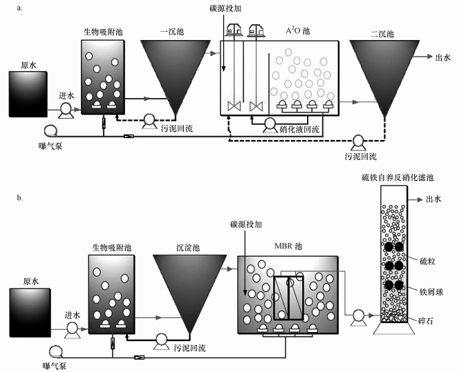 圖 1生物吸附/A2O組合工藝流程(a)及生物吸附/MBR/硫鐵自養(yǎng)反硝化組合工藝(b) 。