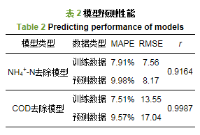 結(jié)合上文, 原始數(shù)據(jù)經(jīng)歸一化和PCA處理后, 分別建立起基于BP神經(jīng)網(wǎng)絡的NH4+-N和COD去除濃度預測模型, 其中, 輸入層為進水NH4+-N、NO2--N、COD和pH, 輸出層分別為NH4+-N和COD去除濃度, 通過試錯法選用5個節(jié)點作為隱含層節(jié)點, 模型的拓撲結(jié)構(gòu)最終為4-5-1.從實驗樣本中選取120組數(shù)據(jù)作為訓練樣本, 24組數(shù)據(jù)作為檢驗樣本.值得注意的是, 模型的訓練樣本和檢驗樣本的選取都應包含多種條件.選用函數(shù)tansig和logsig作為隱含層和輸入層神經(jīng)元的傳遞函數(shù), 選用函數(shù)trainlm作為訓練函數(shù).網(wǎng)絡的學習速率為0.3, 學習動量常數(shù)為0.001, 目標誤差為0.015, 最大迭代為1000次.仿真結(jié)果如圖 4和表 2所示.