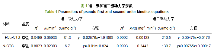 采用準(zhǔn)一級和準(zhǔn)二級動(dòng)力學(xué)方程,描述亞甲基藍(lán)從廢水?dāng)U散到FeCl3-CTS的動(dòng)力學(xué)過程(賈海紅等, 2011).準(zhǔn)一級和準(zhǔn)二級動(dòng)力學(xué)方程如式(3)、(4)所示: