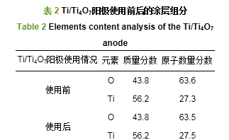 Ti/Ti4O7陽(yáng)極表面的SEM掃描結(jié)果如圖 2b和2c所示.使用之前,Ti/Ti4O7陽(yáng)極的涂層材料在鈦基板表面覆蓋致密,涂層均勻、連續(xù),沒(méi)有裂縫.在反復(fù)進(jìn)行電化學(xué)實(shí)驗(yàn)25次之后,陽(yáng)極表面形態(tài)基本沒(méi)有變化.能譜定量數(shù)據(jù)(EDS)顯示(表 2),Ti/Ti4O7陽(yáng)極表面的組成元素為T(mén)i和O,使用之前其原子數(shù)量比分別為27.4%和63.6%,這與Ti4O7分子中Ti和O的原子數(shù)量比(4:7)一致,說(shuō)明電極表面的涂層材料為T(mén)i4O7.使用之后,陽(yáng)極表面Ti和O的原子數(shù)量比例變化不大,說(shuō)明制備的Ti/Ti4O7陽(yáng)極的穩(wěn)定性較好.