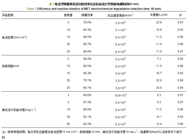在使用Ti/Ti4O7電極進(jìn)行電化學(xué)氧化降解美托洛爾的實(shí)驗(yàn)中,測(cè)定不同電流密度(5~25 mA·cm-2)、極板間距(5~25 mm)和初始濃度(3~50 mg·L-1)等參數(shù)條件下,反應(yīng)過(guò)程中美托洛爾濃度的變化,分析反應(yīng)過(guò)程中電化學(xué)氧化法對(duì)美托洛爾溶液的去除率,并對(duì)實(shí)驗(yàn)結(jié)果進(jìn)行半對(duì)數(shù)線性回歸擬合分析,通過(guò)實(shí)驗(yàn)結(jié)果分析,可以得出結(jié)果均遵循一級(jí)反應(yīng)動(dòng)力學(xué),其中R2均大于0.95,同時(shí)得出在不同反應(yīng)條件下電化學(xué)氧化處理美托洛爾過(guò)程中反應(yīng)速率常數(shù)k,半衰期(t1/2)和R2的變化.結(jié)果如表 3所示.