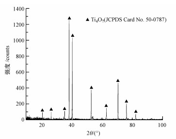 白色TiO2粉末經(jīng)過(guò)高溫氫氣還原之后,生成了藍(lán)黑色Ti4O7粉末,其SEM掃描結(jié)果如圖 2a所示.生成的Ti4O7粉末高度聚合,呈不規(guī)則形狀.經(jīng)過(guò)高溫氫氣還原,Ti4O7粉末顆粒尺寸大約在18~63 μm,比TiO2粉末顆粒大得多.Ti4O7粉末在室溫下的XRD射線衍射圖顯示(圖 3),制備的粉末主要存在Ti4O7衍射峰(90.8%),這說(shuō)明制備的Ti4O7粉末純度較高.